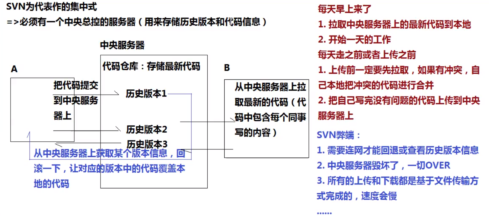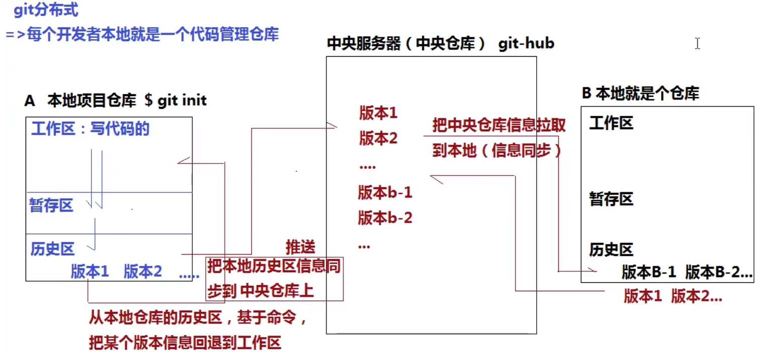 Git是分布式版本控制系统,那么它就没有中央服务器的,每个人的电脑就是一个完整的版本库,这样,工作的时候就不需要联网了,因为版本都是在自己的电脑上。既然每个人的电脑都有一个完整的版本库,那多个人如何协作呢?比如说自己在电脑上改了文件A,其他人也在电脑上改了文件A,这时,你们两之间只需把各自的修改推送给对方,就可以互相看到对方的修改了。