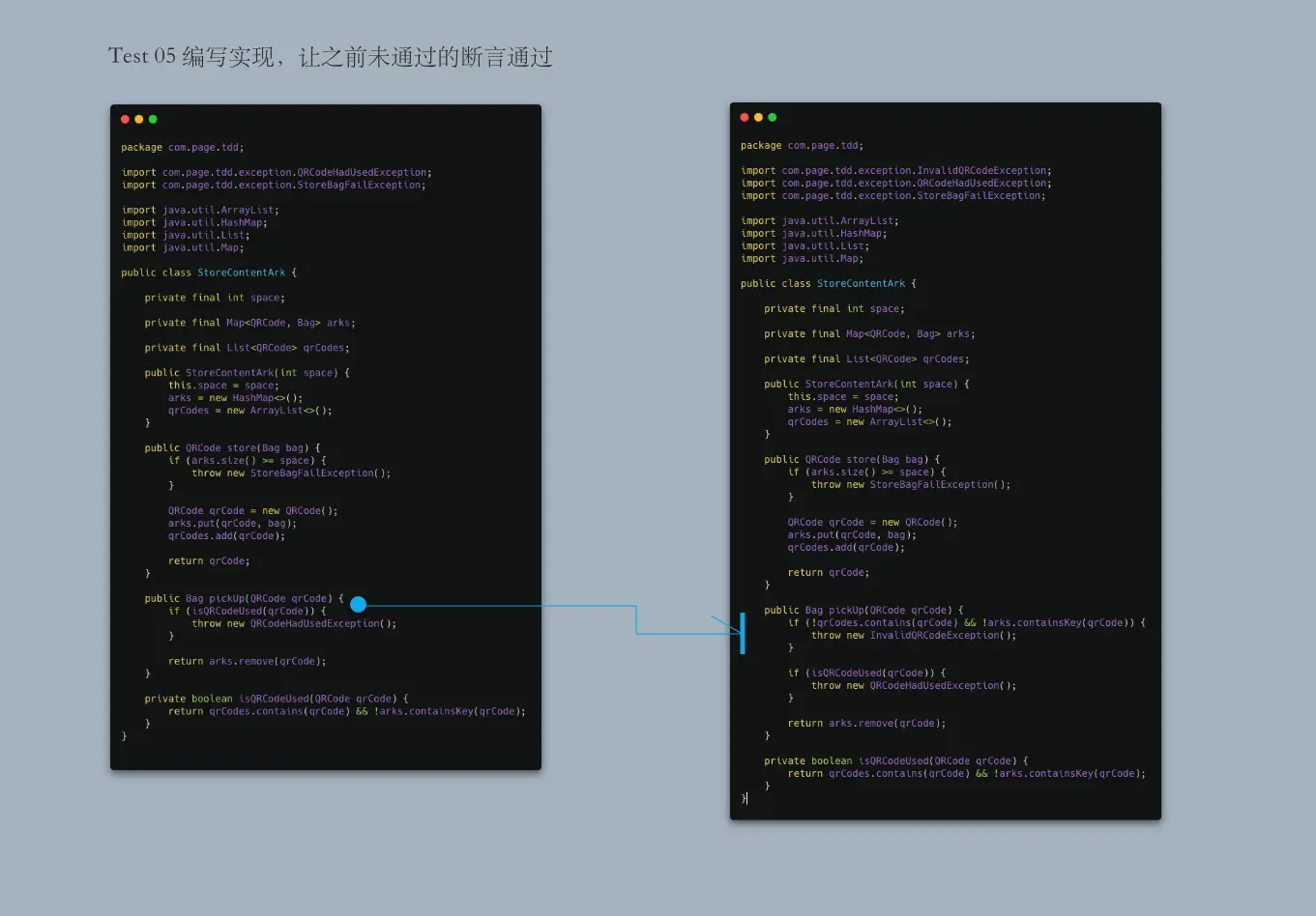 绿 : 实现业务代码,刚才失败的断言通过