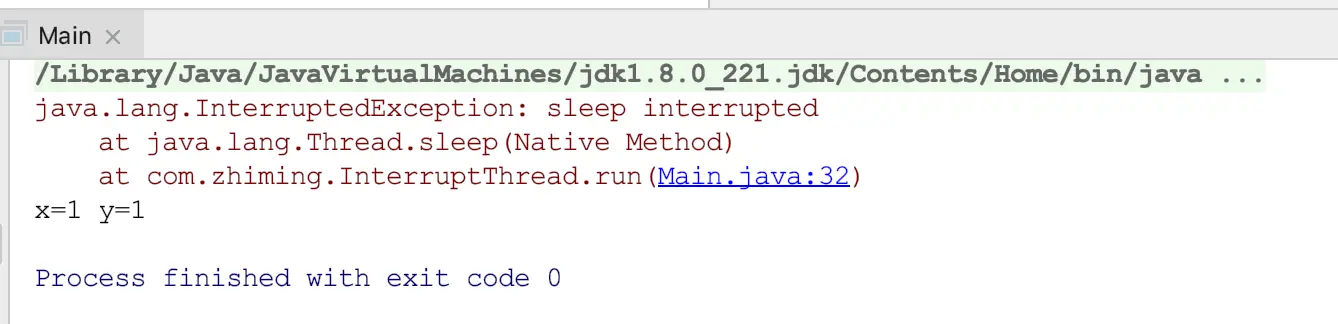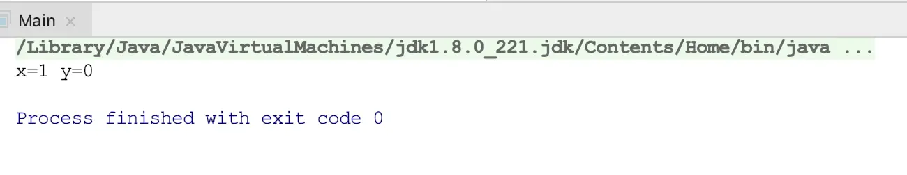 可以看到我们模拟了一个原子操作,按照预期应该是要输出 x = 1 y = 1 的结果,但是线程在毫无察觉的情况下被中断了,有点像被别人"敲了闷棍",根本没有反应的机会。