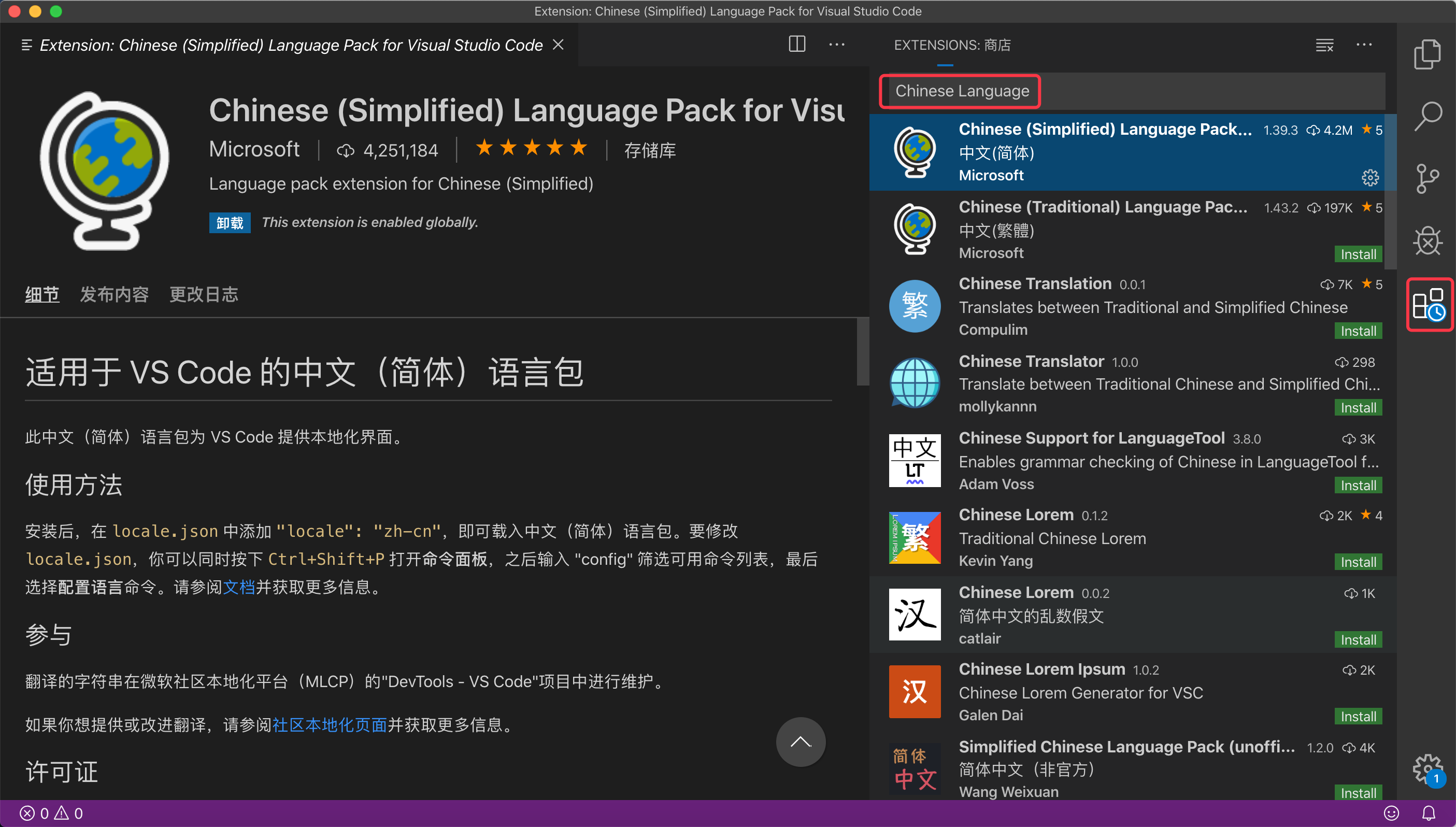 - VS Code汉化包可在VS Code商店里搜索:Chinese (Simplified) Language Pack for Visual Studio Code
