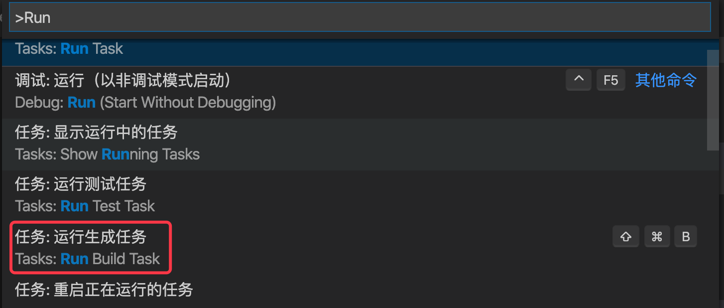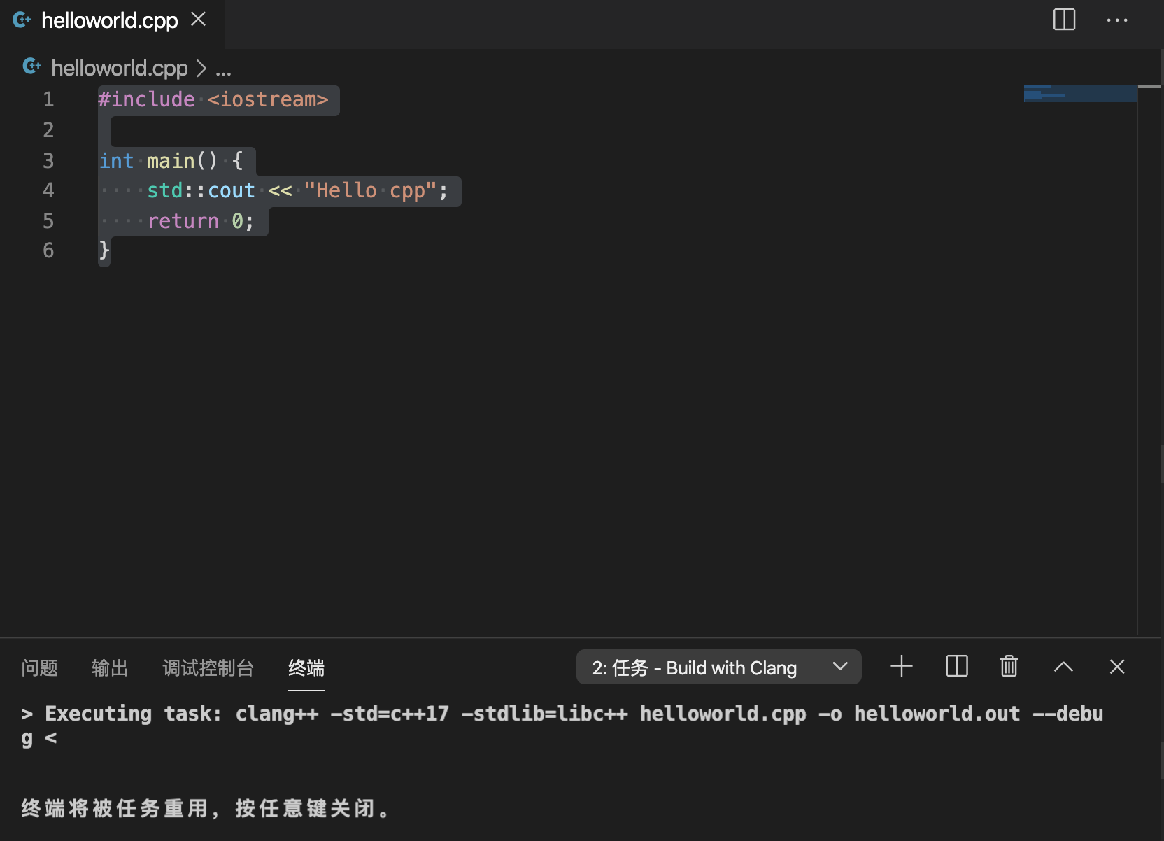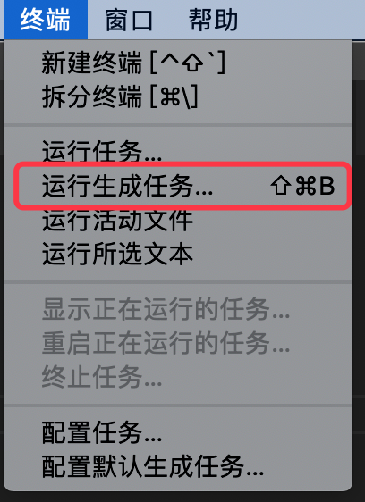 - 在命令面板里选择任务:运行生成任务,或按下快捷组合键⇧⌘B,或选择终端->运行生成任务...,编译运行程序: