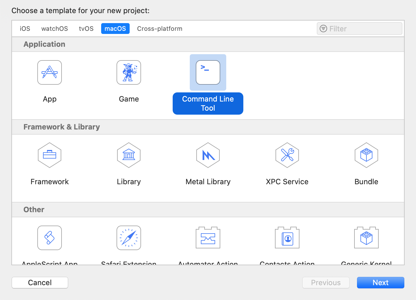 File->New->Project 选择macOS下的Command Line Tool项目模板类型: