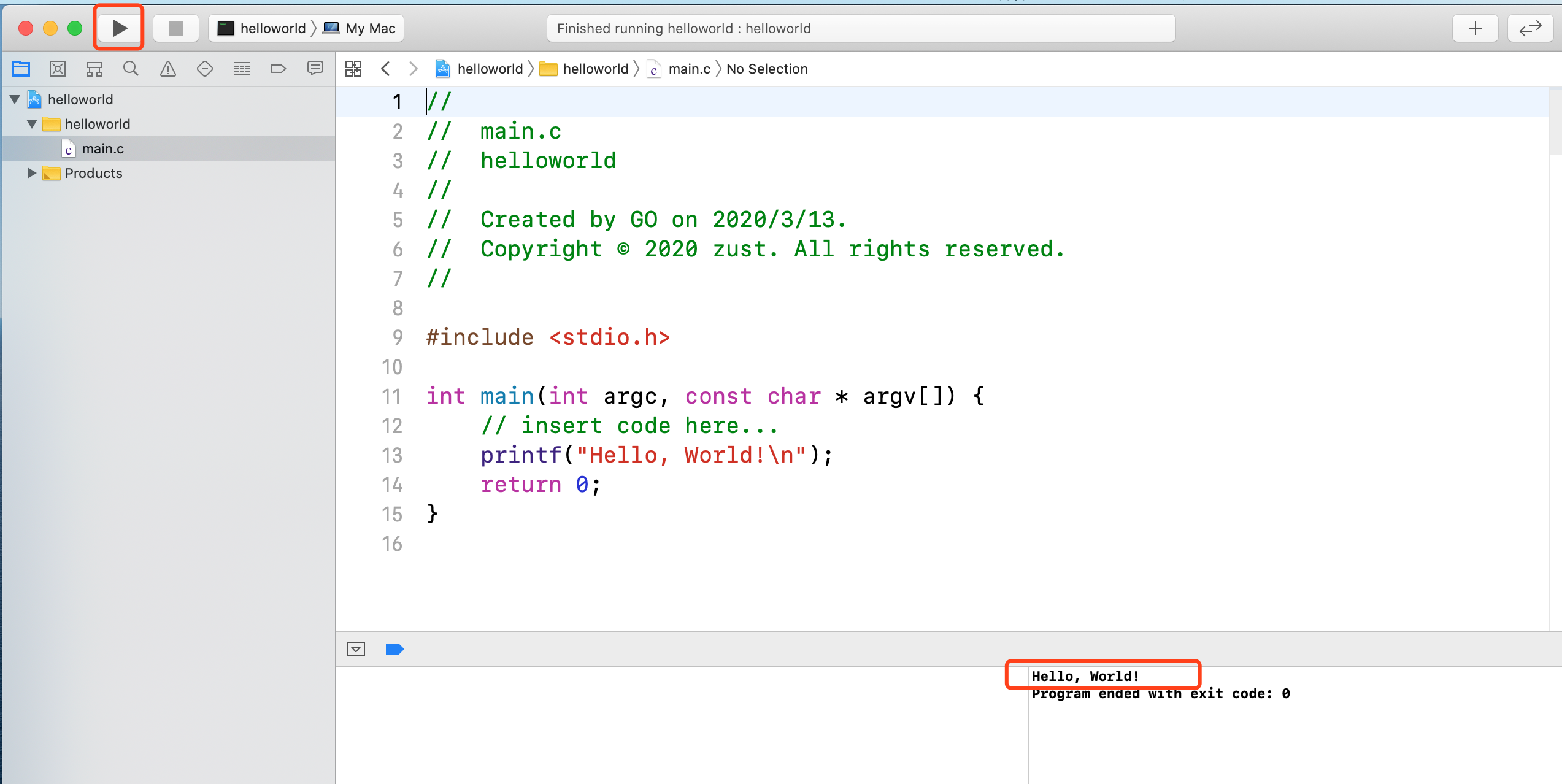 选择C,默认生成main.c文件,点击左上方运行按钮Run结果如下:
