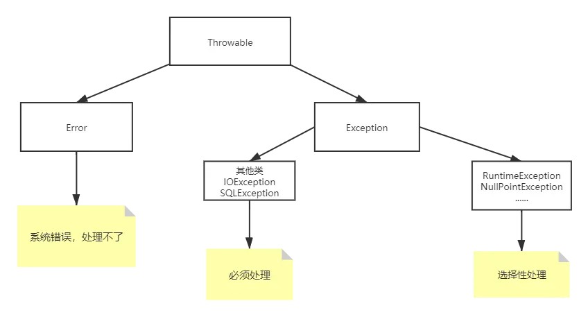 - 继承 Exception 的其他类:必须捕获,通常在 API 文档中会说明这些方法抛出哪些异常。
