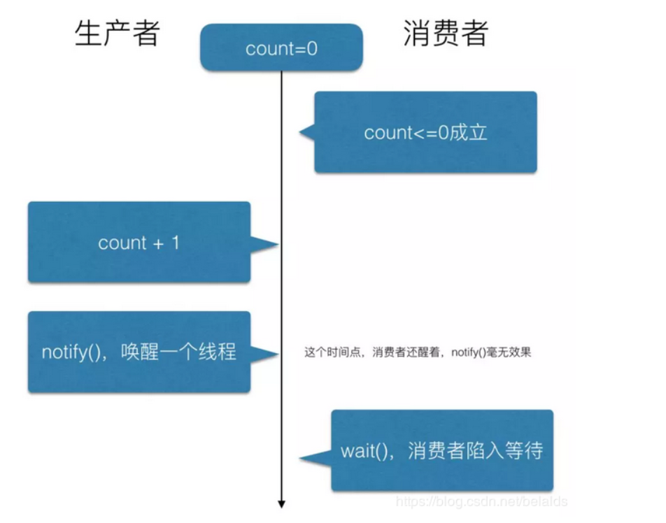 首先我们先假设count = 0,这个时候消费者检查count的值,发现count <= 0的条件成立;就在这个时候,发生了上下文切换,生产者进来了,噼噼啪啪一顿操作,把两个步骤都执行完了,也就是发出了通知,准备唤醒一个线程。这个时候消费者刚决定睡觉,还没睡呢,所以这个通知就会被丢掉。紧接着,消费者就睡过去了……