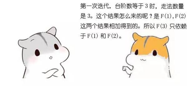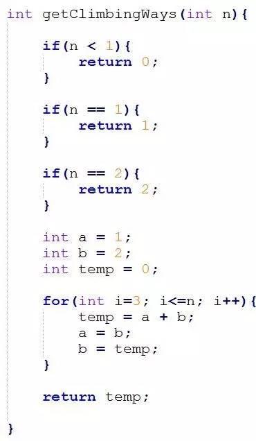 程序从 i=3 开始迭代,一直到 i=n 结束。每一次迭代,都会计算出多一级台阶的走法数量。迭代过程中只需保留两个临时变量a和b,分别代表了上一次和上上次迭代的结果。 为了便于理解,我引入了temp变量。temp代表了当前迭代的结果值。