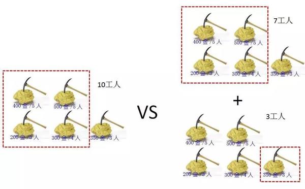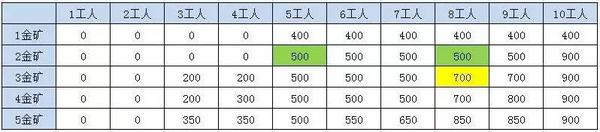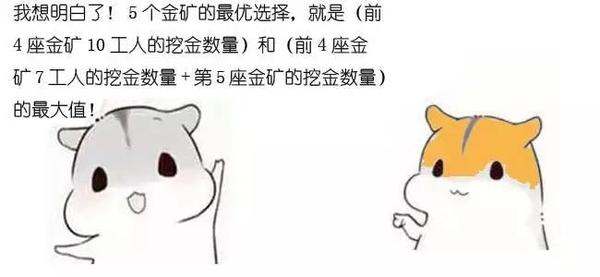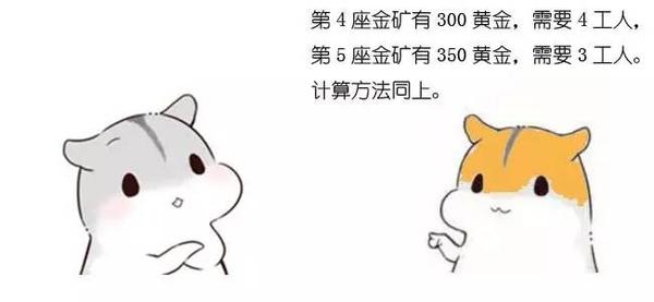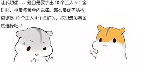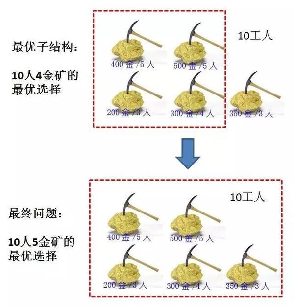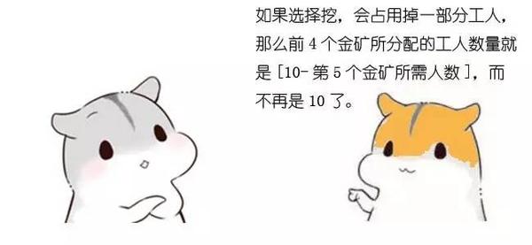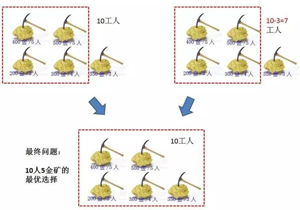每一座金矿都有挖与不挖两种选择,如果有N座金矿,排列组合起来就有2^N种选择。对所有可能性做遍历,排除那些使用工人数超过10的选择,在剩下的选择里找出获得金币数最多的选择。