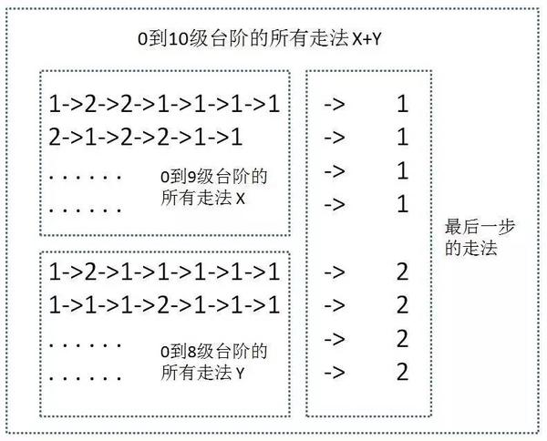比如,每次走1级台阶,一共走10步,这是其中一种走法。我们可以简写成 1,1,1,1,1,1,1,1,1,1。