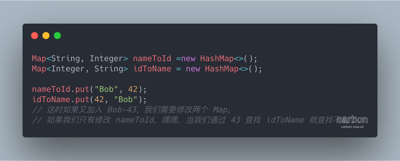 这个需求如果使用 Map 实现,我们就不得不使用两个 Map,维护双向关系,并且任何改动还要保持同步。