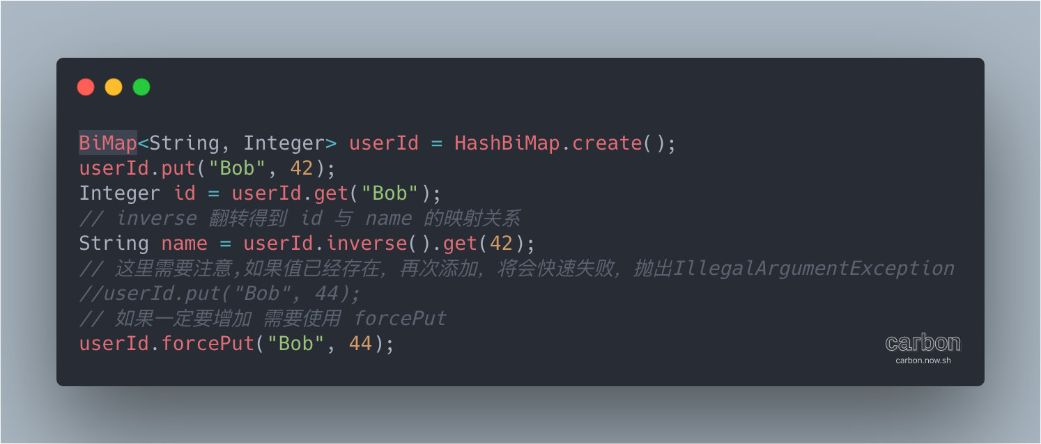 这里需要注意,BiMap#put方法不能加入重复元素, 若加入,将会抛错。如果若特定值一定要替换,可以使用 BiMap#forcePut代替。