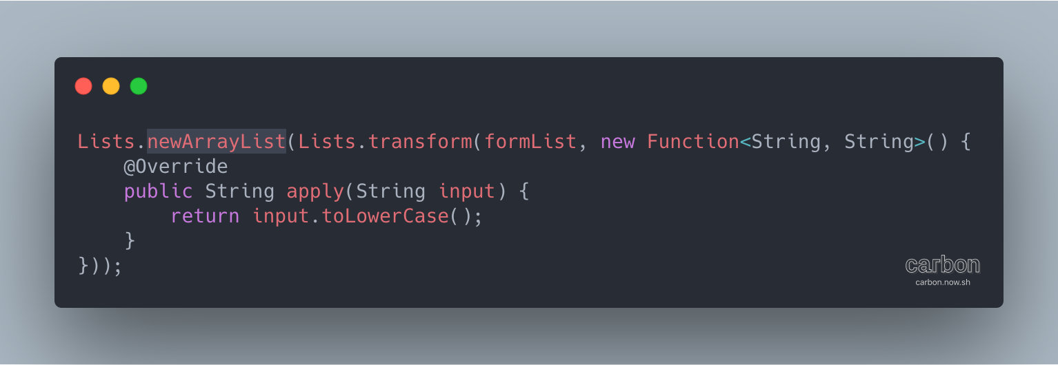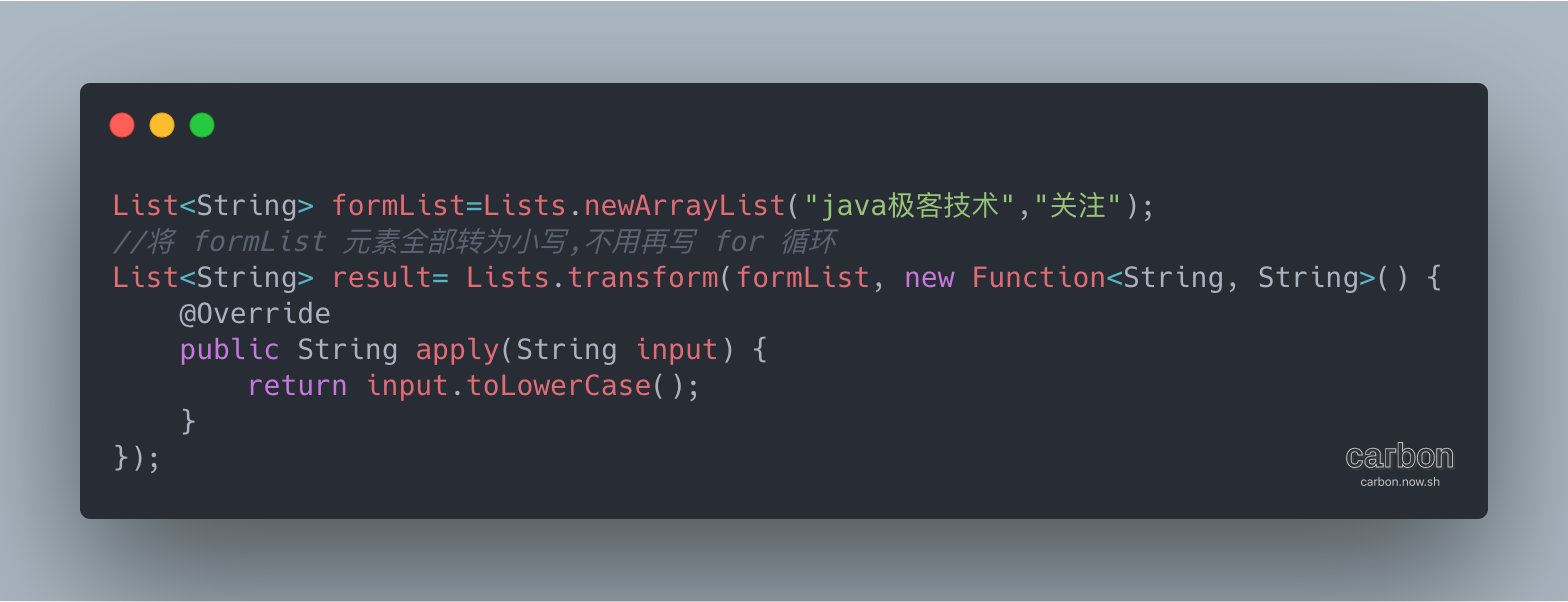 Lists#transform方法可以替代繁琐 for 循环,将元素转化,创建一个新集合类。