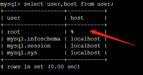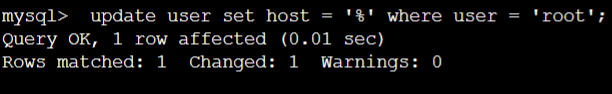 5, update user set host = '%' where user = 'root'; 更新root用户的本地访问为% ,即代表可以远程访问。通常情况下我们的root用户应该只能本地访问,但是我们今天是为了学习方便,所以就设置root可以远程访问了。