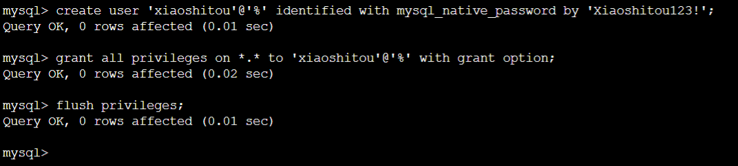 create user 'xiaoshitou'@'%' identified with mysql_native_password by 'Xiaoshitou123!';