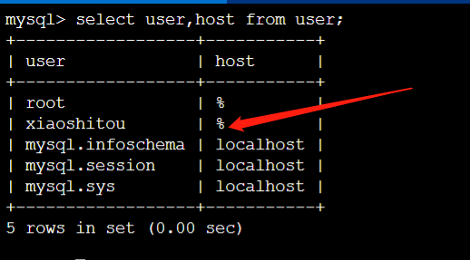 可以看到我们的xiaoshitou用户的host也变成了 %