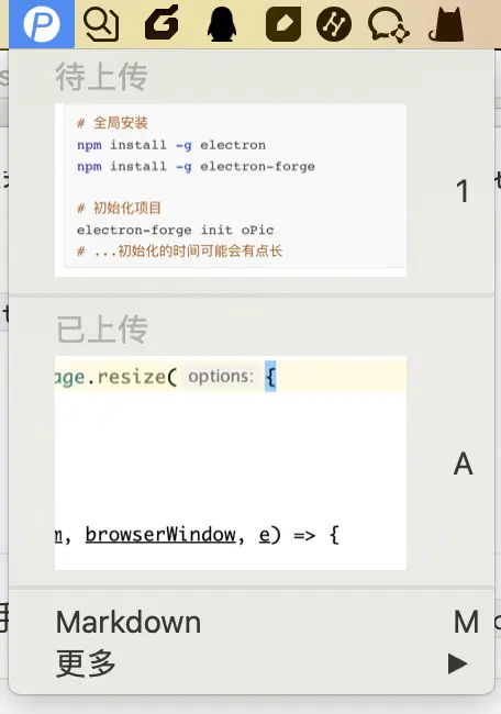 大致对比了一下Flutter Desktop、PyQT和Electron等框架,最后决定使用Electron,花了两三个晚上实现了将剪切板的图片快速上传到七牛上(非广告~)。