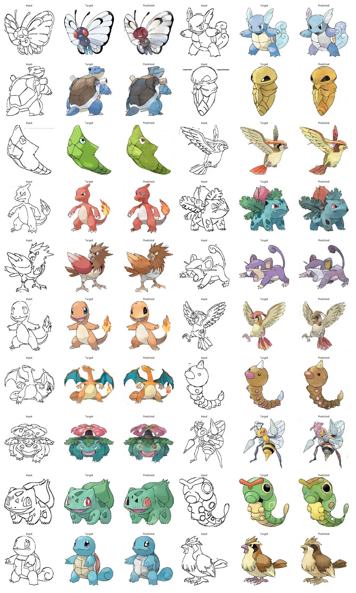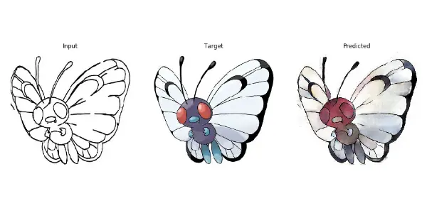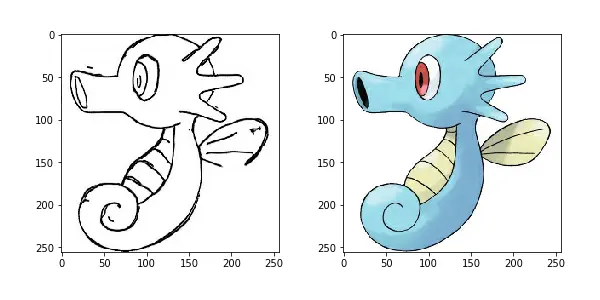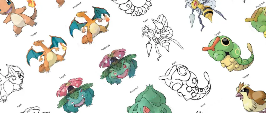 在本案例中,我们用神经网络来给口袋妖怪的线框图上色。