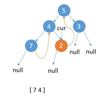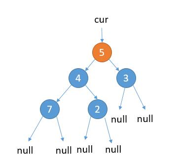 如上图,当前属于情况 1,cur.left 为 null,保存 cur 的值,更新 cur = cur.right。