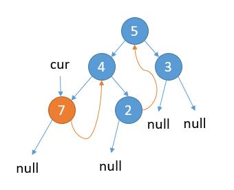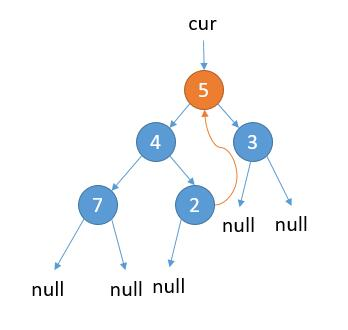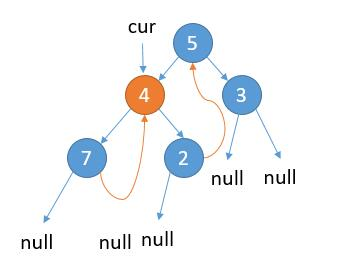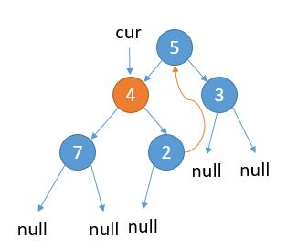 如上图,cur 指向根节点。 当前属于 2.1 的情况,cur.left 不为 null,cur 的左子树最右边的节点的右孩子为 null,那么我们把最右边的节点的右孩子指向 cur。