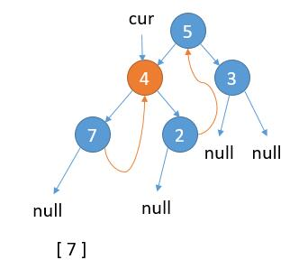 如上图,当前属于 2.2 的情况,cur.left 不为 null,cur 的左子树最右边的节点的右孩子已经指向 cur,保存 cur 的值,更新 cur = cur.right。