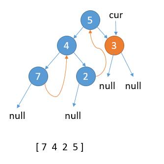 2.2 last.right 不为 null,说明之前已经访问过,第二次来到这里,表明当前子树遍历完成,保存 cur 的值,更新 cur = cur.right