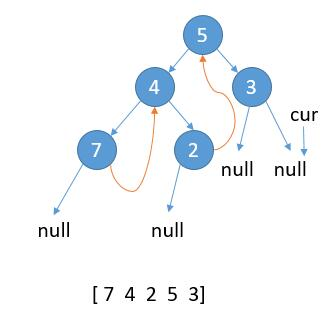 2.1 last.right 为 null,那么将 last.right = cur,更新 cur = cur.left