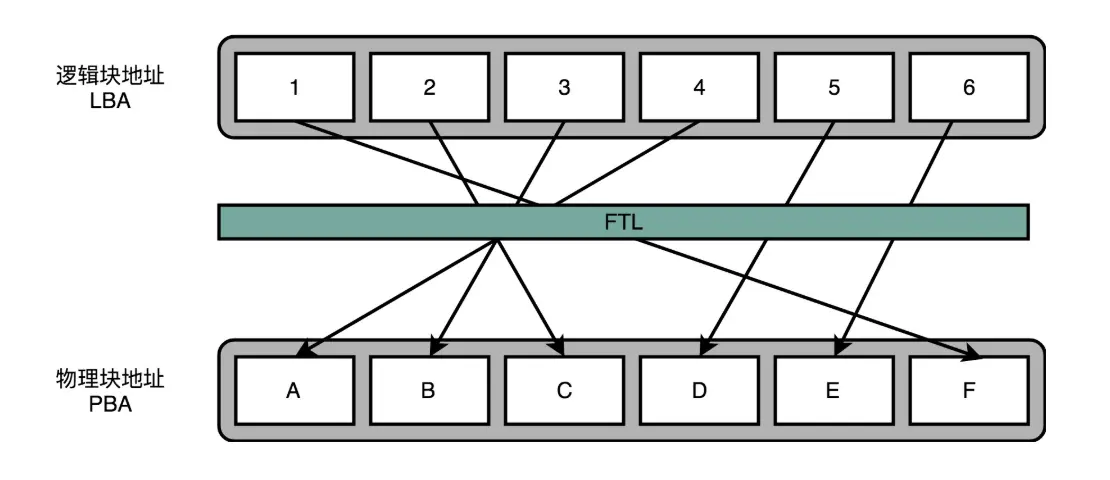 在 FTL 里面,存放了逻辑块地址(Logical Block Address,简称 LBA)到物理块地址(Physical Block Address,简称 PBA)的映射。