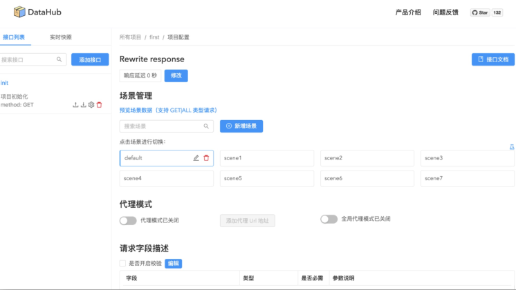 首先,我们会看到大部分支持场景概念的mock平台都是将其场景维护到接口级别,对于复杂项目场景的切换成本过高(例如datahub)。假设我们一个需求功能涉及到十几个、几十个接口,在每次的场景切换会耗费大量的时间,并且你要清楚的知道这些场景是如何排列组合才能出现你需要的效果。这对于我们日常开发的效率、新人临时接手处理问题并不是很友好的体验。(以下为datahub的界面图)