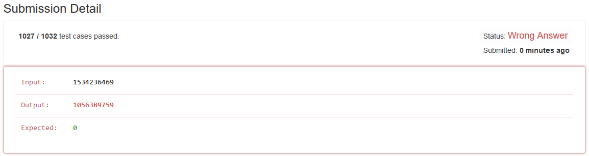 后来改为用long型记录数据(按进位将每个数字相加),并且和Integer.MAX_VALUE相比较,如果发生溢出就返回0.