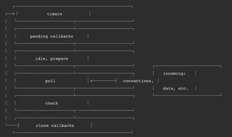 Node中的事件轮询和浏览器中页面的渲染完全不同,它们按照顺序执行,有六个阶段。当队列为空或者执行的回调函数达到阈值,进入下一阶段。