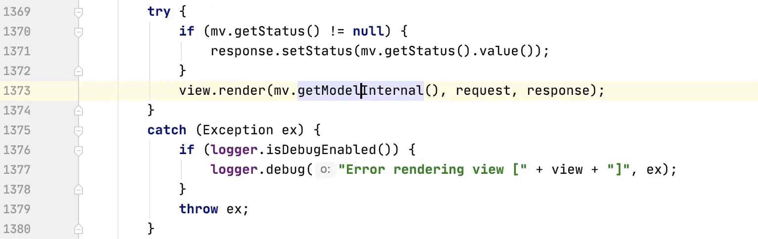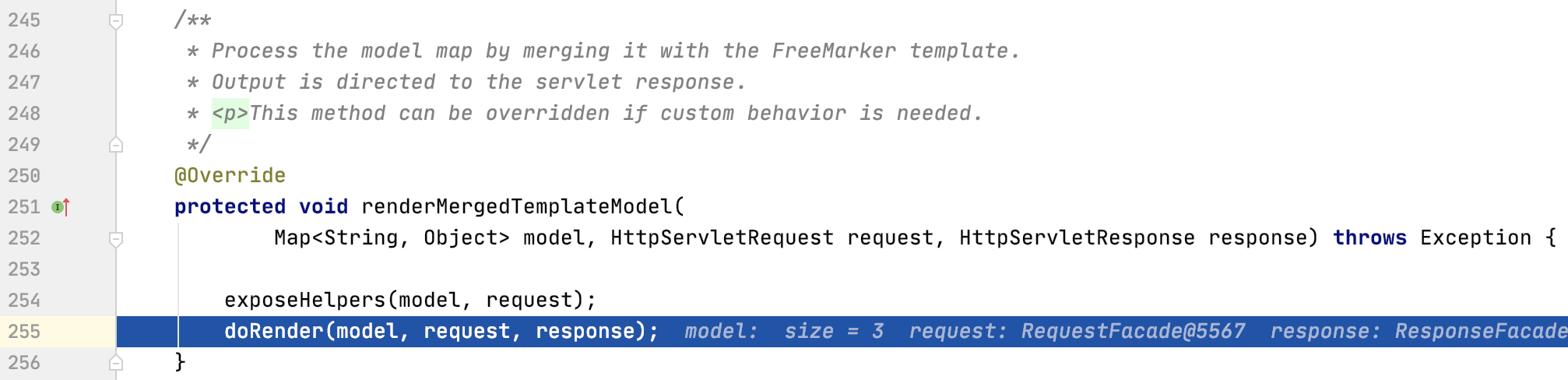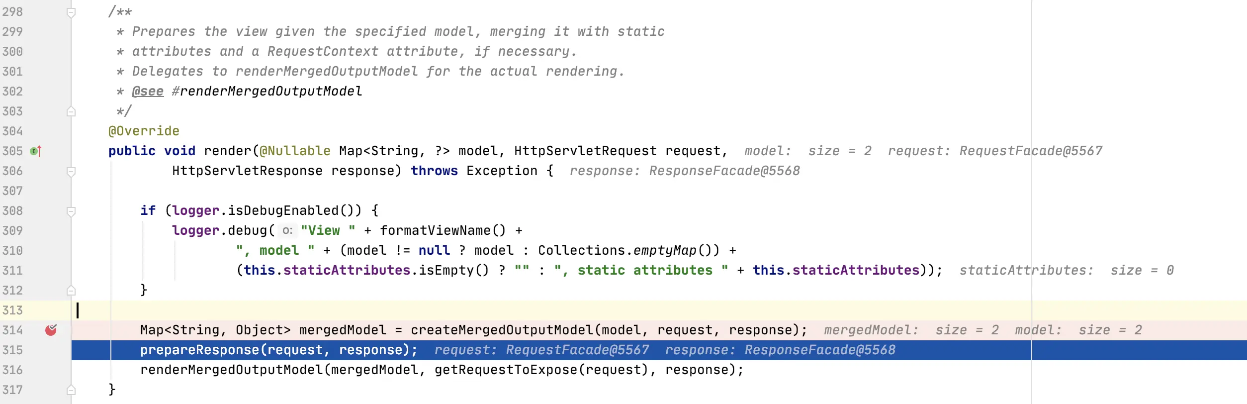 进入 render 方法后,会执行 Prepares the view given the specified model, merging it with static ,通俗讲就是将我们 Request 域或者 Session域 中的值(比如说请求参数回显)和视图解析出来的 ModelAndView 进行合并,这也是为什么我们再模板中可以轻松获得各种作用域值的原因,继续往下看