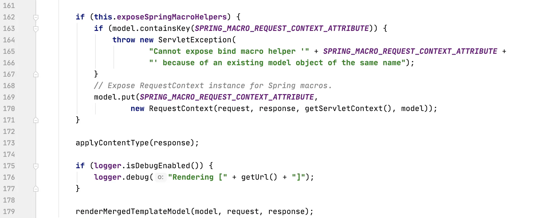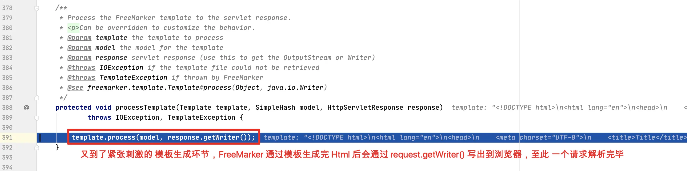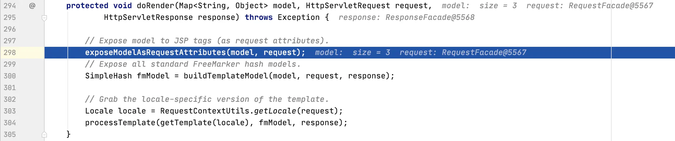 进入 render 方法后,会执行 Prepares the view given the specified model, merging it with static ,通俗讲就是将我们 Request 域或者 Session域 中的值(比如说请求参数回显)和视图解析出来的 ModelAndView 进行合并,这也是为什么我们再模板中可以轻松获得各种作用域值的原因,继续往下看