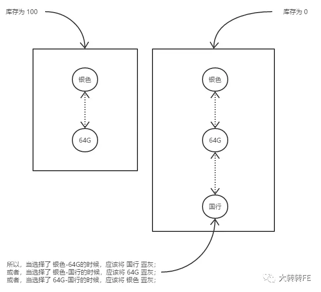 例如,假设 银色-64G-国行这个 sku的库存为 0,则当你选中 银色-64G的时候,应该把国行置灰,当选中 银色-国行,应该把64G置灰,当选中 国行-64G,应该把银色置灰