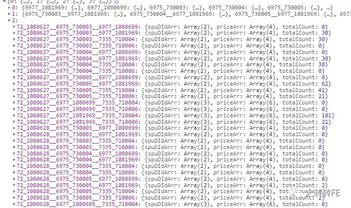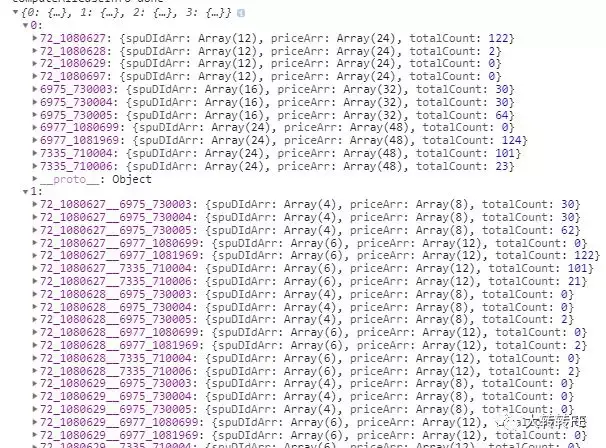 上述表示,对于选中了 1(下标为 0)个 sku属性的情况,共有 11种 sku选法,每种选法都有对应的 价格范围和总库存信息,例如 72_1080627表示,当选中了 版本为国行 这个 sku属性时,其价格范围数组 priceArr 和总库存 totalCount;对于选中了 2(下标为 1)个 sku属性的情况,共有 44种 sku选法,每种选法都有对应的 价格范围和总库存信息,例如 72_1080627__6975_730003表示,当选中了 版本为国行,颜色为深空灰色 这个 sku属性时,其价格范围数组 priceArr 和总库存 totalCount……等等