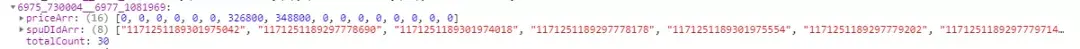 ]其中,paramIdJoin是 sku属性组合连接而成,可分为 72_1080697、6975_730004、 6977_1081969、 7335_710006这个四个单元,每个单元又由 paramId 和 valueId 连接而成,所以 72_1080697__6975_730004__6977_1081969__7335_710006的意思就是 版本为日韩、颜色为银色、成色为全新、配置为256G的 sku组合,对应的总库存 count为 98,价格范围为 7000 ~ 8978,即最低价是 7000,最高价是 8978(如果只有一个价格没有高、低价格之分,那数组中的项就是那一个价格就行了),spu的标识 id spuDId为 98002993445