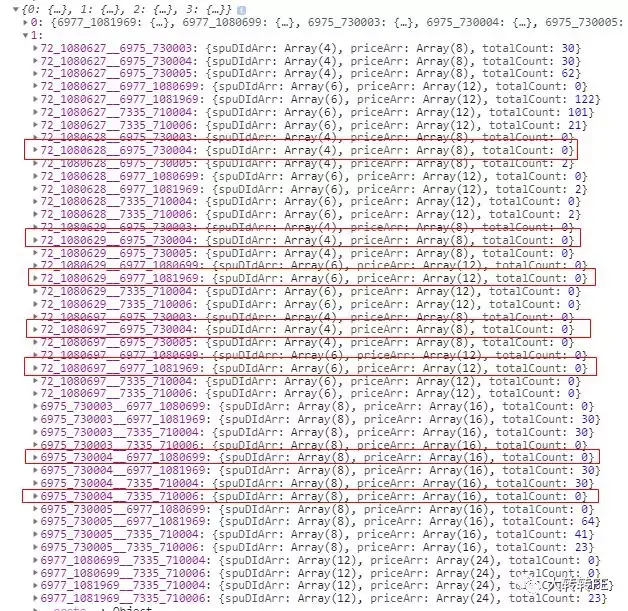然后再对这被筛选出来的 7条数据进行出来,得到需要被置灰的 sku属性的集合,也就是这些数据的 key字符串中,去掉当前已经选中的 sku属性,即 6977_1081969 和 6975_730004后,还剩下的值的集合