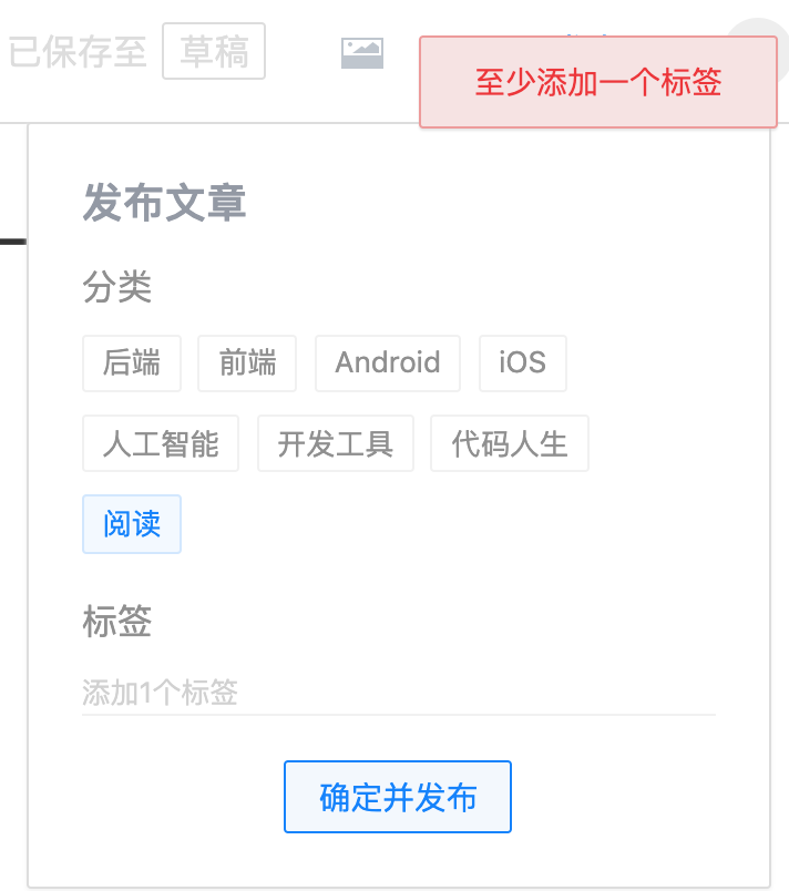 采坑--掘金文章发不了 sun麋鹿先生 2020-03-13 1,026 阅读1分钟 问题:掘金发布文文章一直提示至少添加一个标签 结果,我在标签哪里一直填写,怎么也不对. 去网上找了好多答案,结果是标签不能自定义,输入一个字符会有提示 然后选择提示的标签,就可以发布 列如: