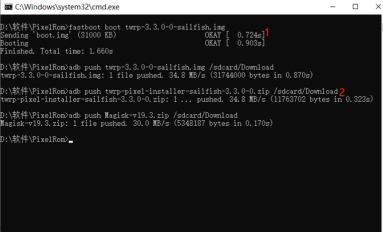 - adb push twrp-pixel-installer-sailfish-3.3.0-0.zip /sdcard/Download,拷贝twrp压缩包