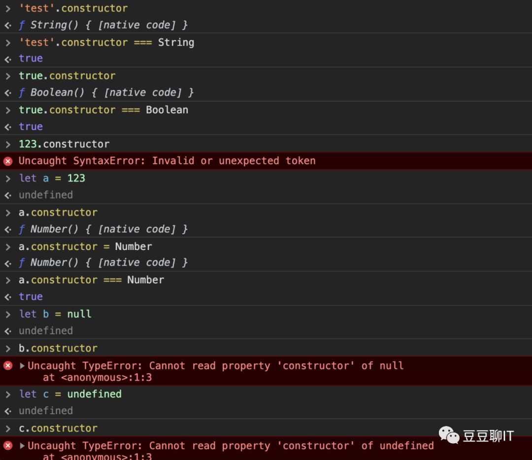 图上可以看出来,Null 和 Undefined 是不能够被判断出来的,还会报错,因为 Null 和 Undefined 都是无效的对象,所以不存在 constructor 这一说。另外一点需要注意的是,constructor 属性是可以被修改的,可能会导致最后的结果不正确。