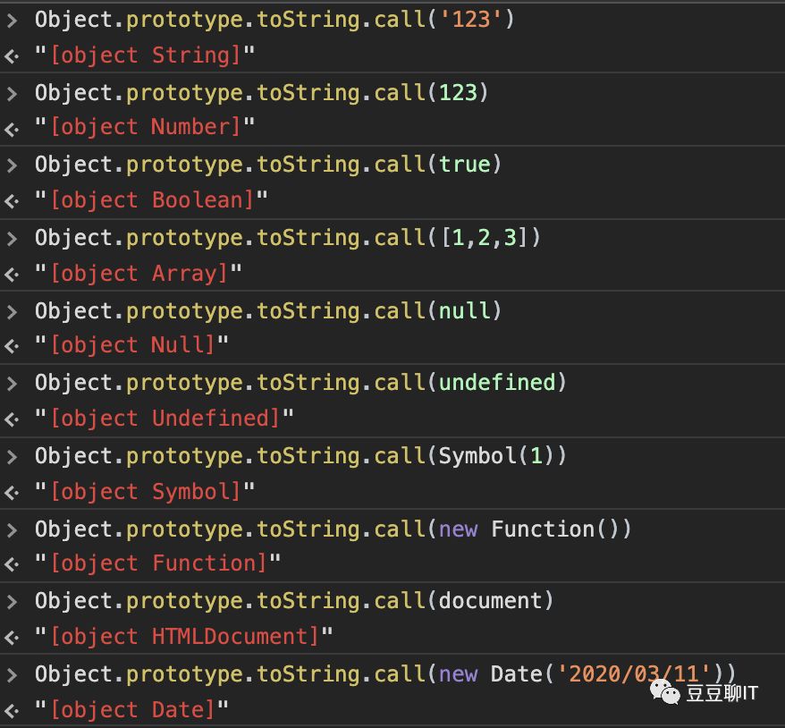 完整写法是 Object.prototype.toString.call(xxx), 就目前来看,这个方法是最好的一个方法来检测所有的数据类型,无论是基本数据类型还是引用数据类型: