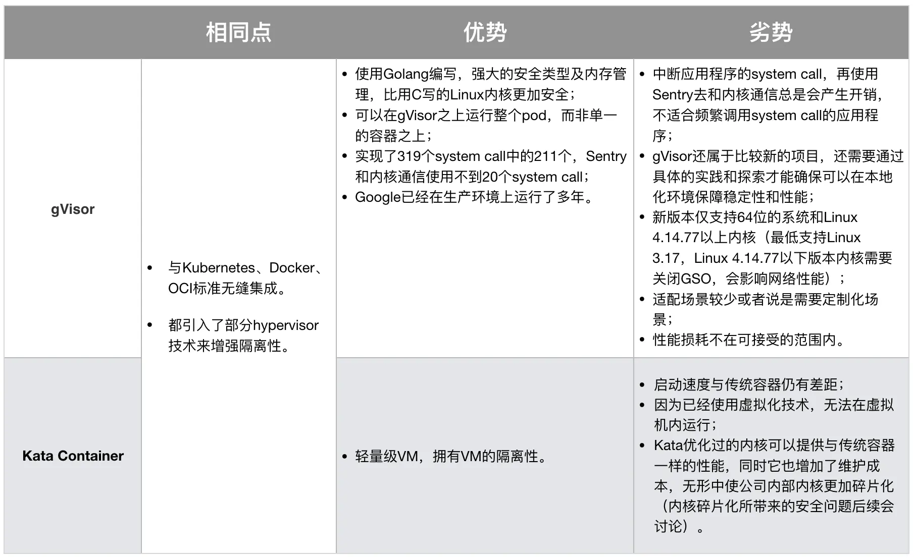 简单地说,gVisor是在用户态和内核态之间抽象出一层,封装成API,有点像user-mode kernel,以此实现隔离。Kata Container采用了轻量级的虚拟机隔离,与传统的VM比较类似,但是它实现了无缝集成当前的Kubernetes加Docker架构。我们接着来看gVisor与Kata Container的异同。