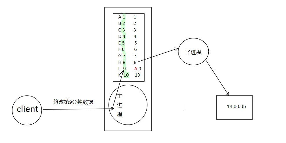 第二种解决思路,Redis开启一个进程,主进程对外提供服务,子进程进行数据备份,这样就可以解决第一种方案里的问题,但是又会带来另一个问题。我们假设子进程数据备份需要10分钟,当子进程备份到第8分钟时,有客户端修改了原来第9分钟备份的数据,当Redis备份到第9分钟时,备份的已经不是18点时刻的数据,显然这也不是我们要的结果。