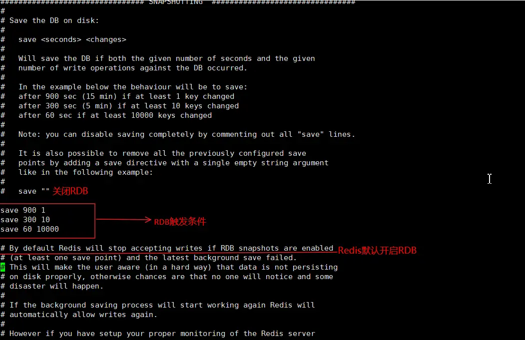 RDB可以采取两种方式开启,一种是在客户端使用save命令手动的开启,我们一般是在关机维护的时候使用save,另一种是bgsave即通过配置文件自动的开启,有趣的是在配置文件中bgsave开启竟然使用的是save标识,我们来看一下配置文件: