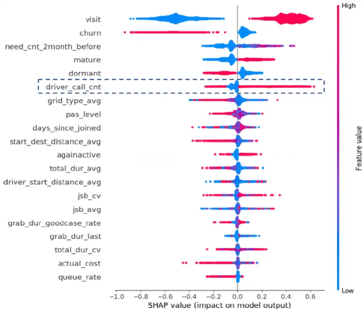 接下来我们需要根据该结果并结合我们的业务逻辑发现影响乘客活跃度重要因子。我们可以比较清晰的看出影响乘客活跃度的部分因素与直觉中预想的并不完全一致,诸如司机来电次数(driver_call_cnt)这类预先未料想到的体验因素,对乘客活跃度的影响较大,司机来电次数越多的乘客,模型倾向于预测其活跃度更高,反映出一定程度上的司乘沟通能够给乘客带来良好的乘车体验,能够正向影响乘客积极性。除此之外,在这个过程中,我们在导师的带领下,学习到了SHAP中的因子重要性可以帮助进行特征筛选,进而构建表现更优业务解释能力更强的模型。