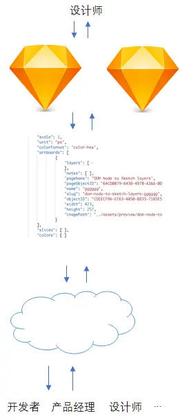 通过这些API,设计稿最终转化成了JSON数据。有了JSON数据,我们就可以为设计师、开发者、产品经理等角色更好的协同做一些工作。如下图所示: