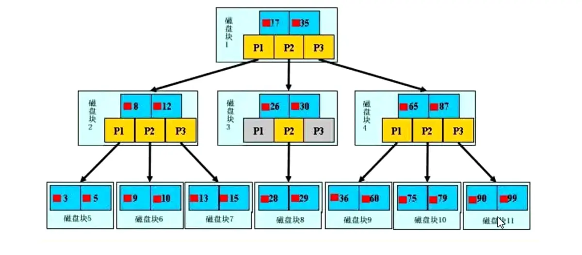 浅蓝色的块--->磁盘块 黄色的块------>指针 深蓝色的块----->数据项 P1表示小于17的磁盘块,P2表示在17和35之间的磁盘块,P3表示大于35的磁盘块 真实的数据库都存在与叶子节点,非叶子节点不存储真实的数据,只存储指引搜索方向的数据项