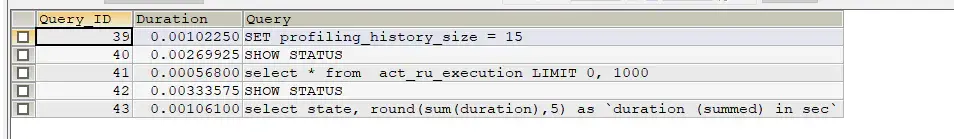 1.查看当前MySQL版本是否支持:SHOW variables like 'profiling' 默认为关闭 2.开启功能:set profiling = on; 3.运行SQL 4.查看结果:show profiles