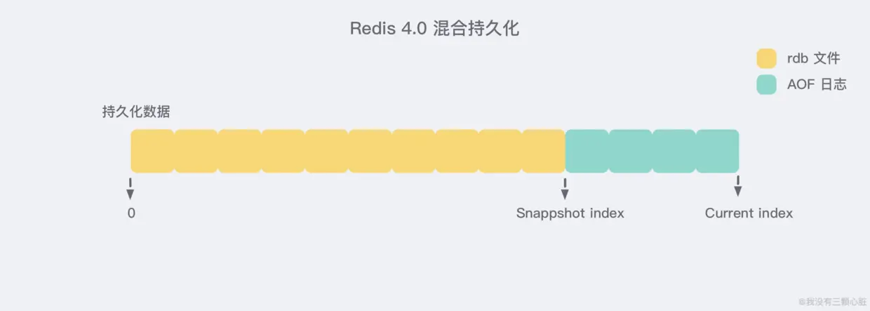 Redis 4.0 为了解决这个问题,带来了一个新的持久化选项——混合持久化。将 rdb 文件的内容和增量的 AOF 日志文件存在一起。这里的 AOF 日志不再是全量的日志,而是 自持久化开始到持久化结束 的这段时间发生的增量 AOF 日志,通常这部分 AOF 日志很小: