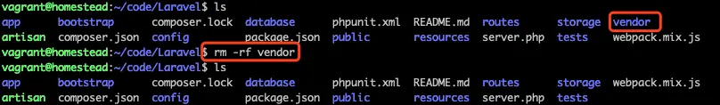 // 删除 Laravel 项目根目录中的 vendor 文件夹,操作命令:
