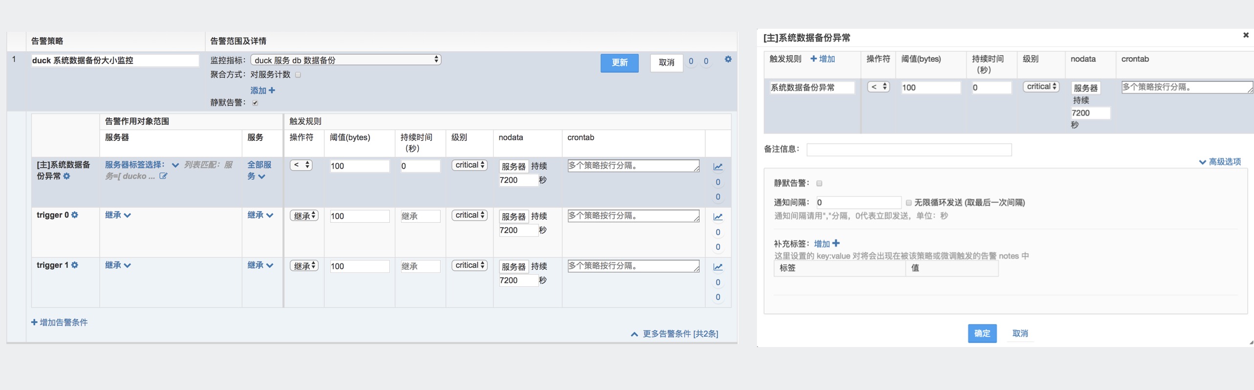 - 不同时段区分告警方式策略:工作日工作时段在公司时,通过邮件/钉钉/微信发送告警能更加节省成本;半夜或者周末发生故障时,通过邮件发送告警能保证实时性;另外可以通过时间段的设置屏蔽部分服务自动重启时所带来的误告警。
