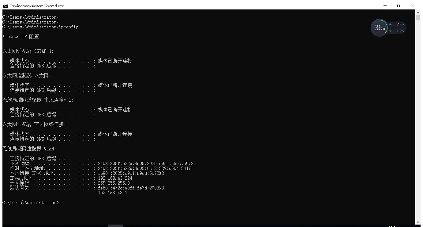 我们可以在命令行中输入ipconfig来查看我们的IP地址(此处使用的是CMD):